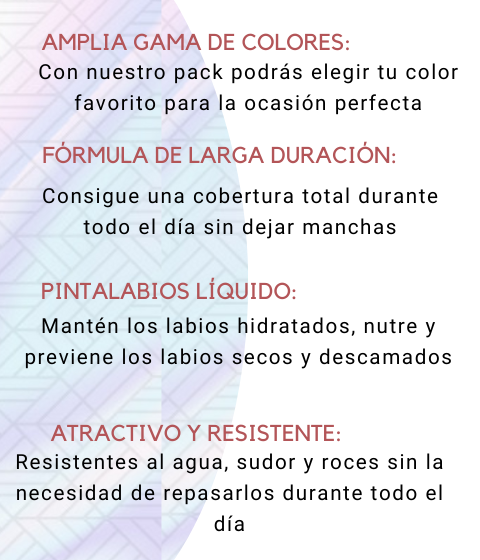 Este set de 6 pintalabios puede ayudarte a dar ese toque final perfecto para cada ocasión con una fórmula de larga duración, están diseñados para nutrir y cuidar tus labios evitando sequedad. Puedes usarlos para cualquier momento y lugar y sentirte más segura y sobre todo, más cómoda. Conseguirás unos labios atractivos e hidratados siempre a la moda